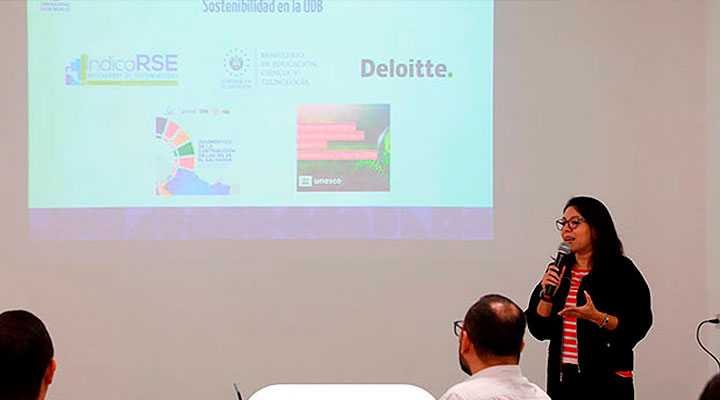 junto a Karina Salguero, directora del Departamento de Proyección Social, presentaron el modelo RESIES como herramienta para evaluar la sostenibilidad