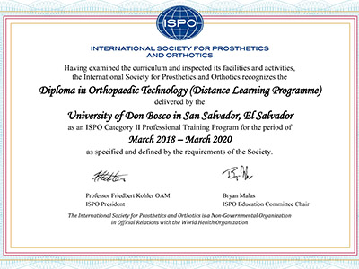 El Técnico en Ortesis y Prótesis a distancia de la Universidad Don Bosco recibió la reacreditación, categoría II, por parte de la Sociedad Internacional de Ortesis y Prótesis (ISPO por sus siglas en inglés), la cual reconoce el cumplimiento de estándares de calidad establecidos por dicha organización junto con la Organización Mundial de la Salud (OMS) para la formación técnica profesional en este campo.