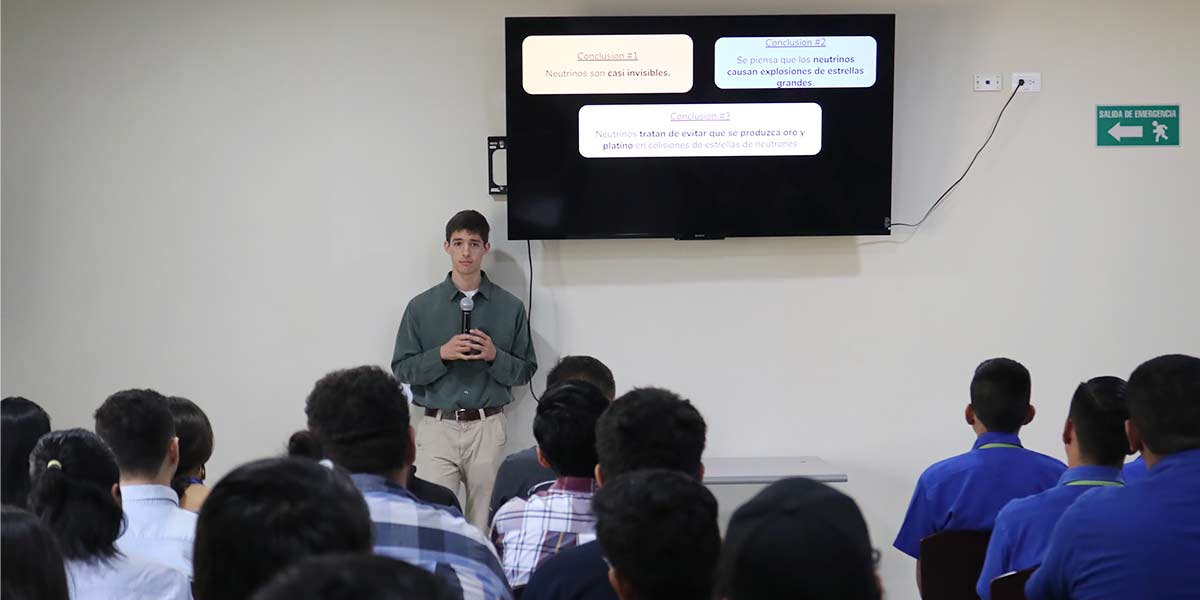 Este experto internacional dedicó un espacio en su agenda para impartir la conferencia El neutrino enigmático: la partícula que contiene los misterios del universo, en el Observatorio Micro Macro OMM, de la Universidad Don Bosco; a la cual asistieron cerca de 90 estudiantes de diferentes carreras de la UDB y de la Escuela de Aviación Dárdano.