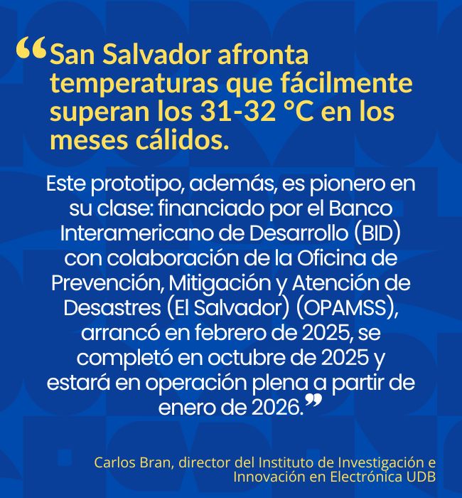 Este proyecto buscó crear un prototipo de climatización geotérmica que transforme la manera en que se gestiona el confort térmico en edificaciones urbanas del país. Representa para la UDB una innovación que articula docencia, ciencia y compromiso ambiental. Según explicó el director del Instituto de Investigación e Innovación en Electrónica Carlos Bran, la iniciativa surge como respuesta a la necesidad de soluciones sostenibles para el confort térmico en zonas densamente pobladas como San Salvador, donde el aumento de temperaturas y la urbanización acelerada demandan nuevas alternativas de eficiencia energética.