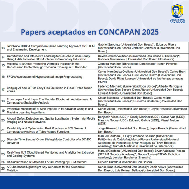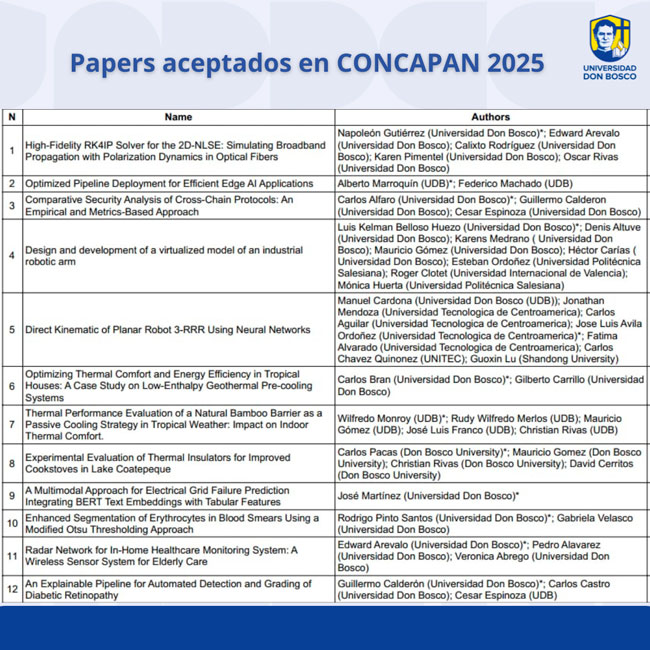 La intervención de los investigadores UDB consistió en la presentación de artículos académicos, que fueron aceptados tras un riguroso proceso de revisión por el equipo de IEEE. En esta edición, la conferencia incluyó trabajos en áreas de vanguardia como inteligencia artificial, robótica, energías renovables, automatización, ciberseguridad y otras tecnologías disruptivas, áreas en las cuales la Universidad Don Bosco tiene una progresiva fortaleza académica.