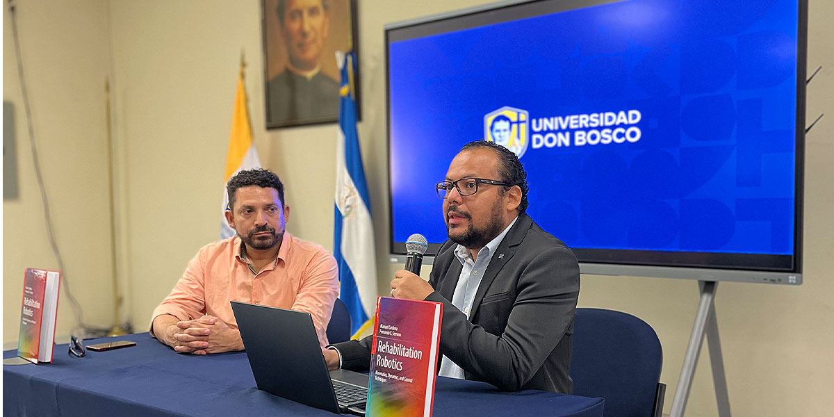 En en el auditorio del campus Antiguo Cuscatlán de la Universidad Don Bosco se llevó a cabo la presentación del libro "Rehabilitation Robotics: Kinematics, Dynamics, and Control Techniques" del vicerrector de Ciencia y Tecnología, Manuel Cardona en coautoría con Fernando Serrano, de la Universidad Politécnica de Cataluña, España.