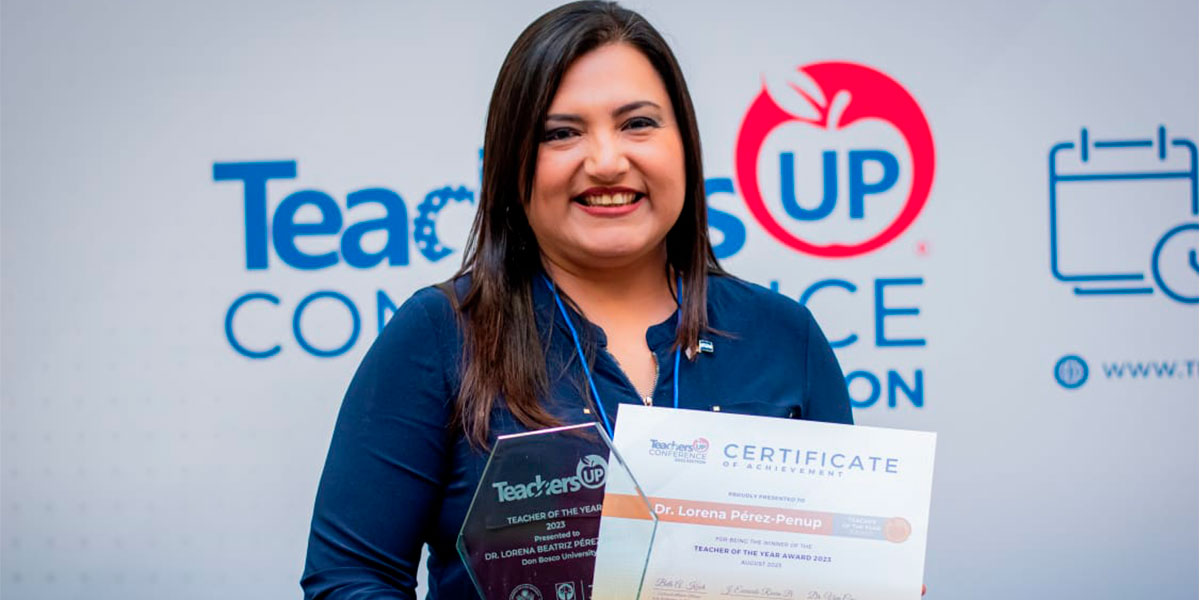 Lorena Pérez-Penup, profesora investigadora del Instituto de Investigación y Formación Pedagógica y docente de la Maestría en Gestión del Currículum, Didáctica y Evaluación por Competencias de la Universidad Don Bosco, recibió el Premio al Profesor del Año edición 2023 que otorga la iniciativa Teacher Up.
