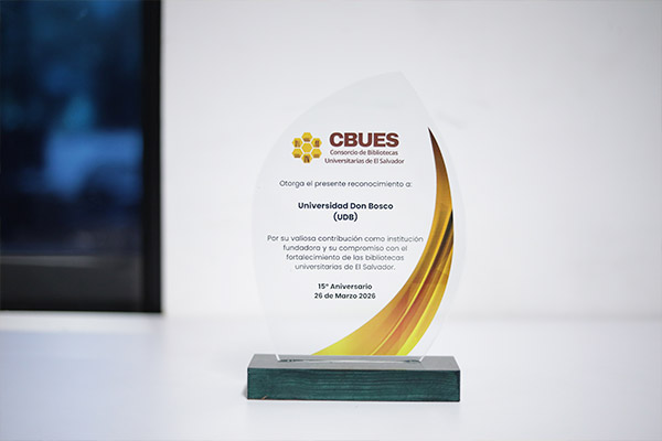 En un evento convocado por el Consorcio de Bibliotecas Universitarias de El Salvador (CBUES), la Universidad Don Bosco recibió un reconocimiento como miembro del grupo promotor del Consorcio, en el marco de la celebración de sus 15 años de trayectoria.