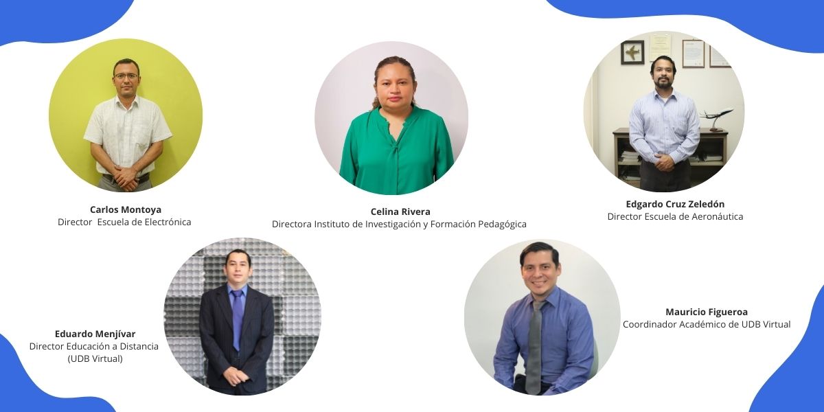 Los profesionales UDB que concluyeron la formación fueron: Eduardo Menjívar, director de Educación a Distancia (UDB Virtual); Celina Rivera, directora del Instituto de Investigación y Formación Pedagógica; Edgardo Zeledón, director de la Escuela de Aeronáutica; Carlos Montoya, director de la Escuela de Electrónica y Mauricio Figueroa, coodinador académico de UDB Virtual.