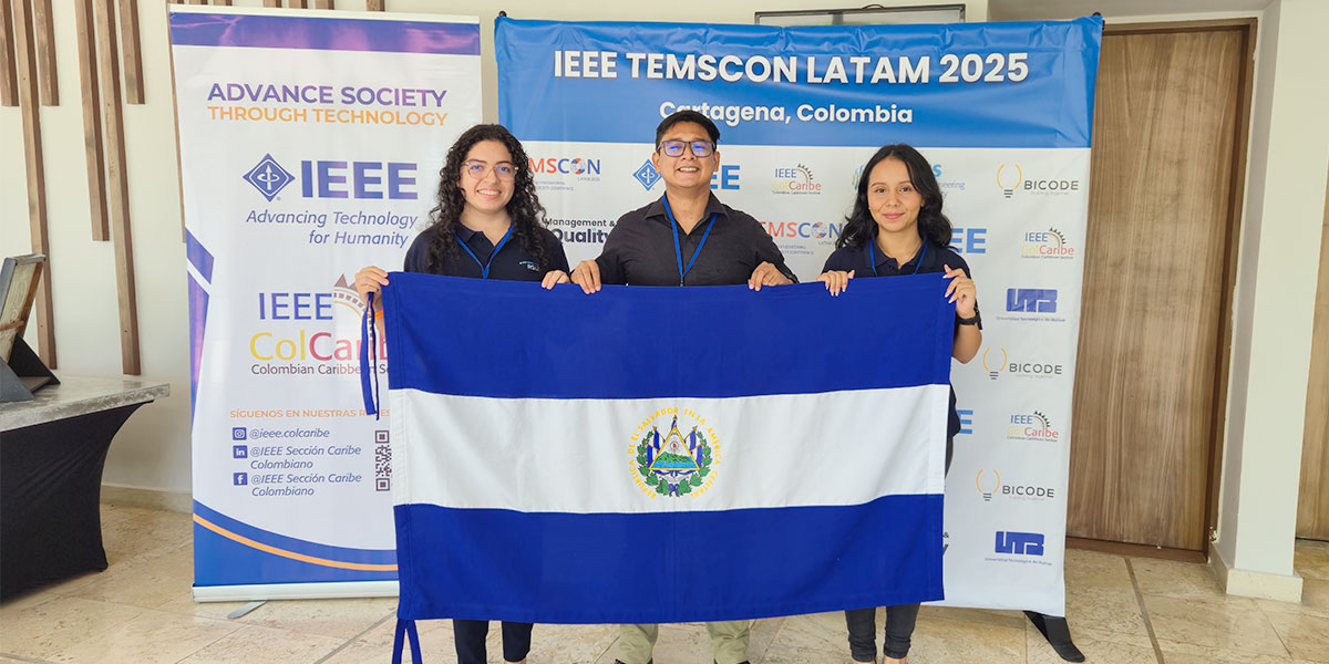 Estefany Valencia y Julissa Batres, estudiantes de Ingeniería Industrial junto a Bryan Vásquez, graduado de Ingeniería Mecatrónica representaron a la Universidad Don Bosco y a El Salvador en el IEEE TEMSCON LATAM 2025, un congreso internacional organizado por la Technology and Engineering Management Society (TEMS) de IEEE.
